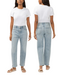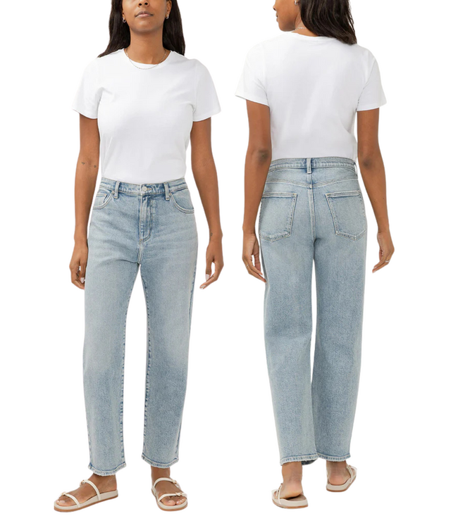 - Relaxed straight leg ankle length jeans in a light indigo wash