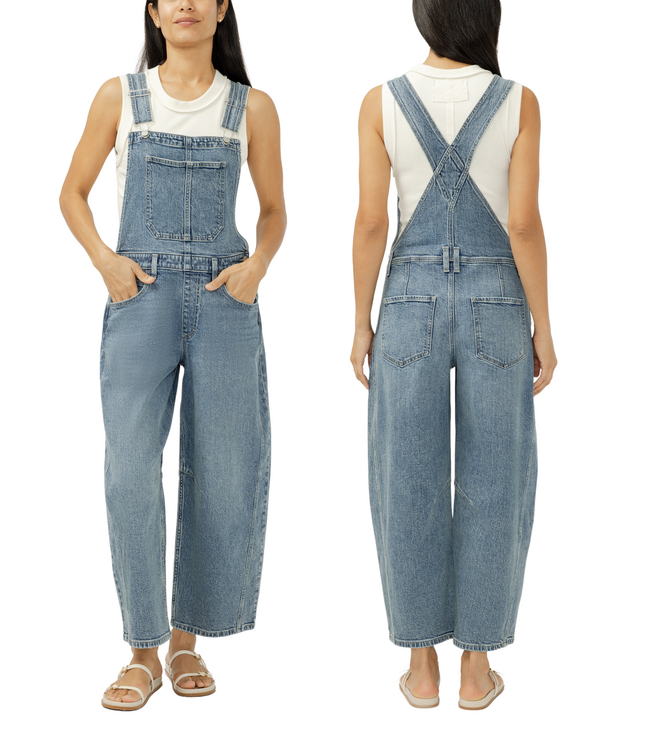 •Barrel leg overall jeans in a medium indigo wash