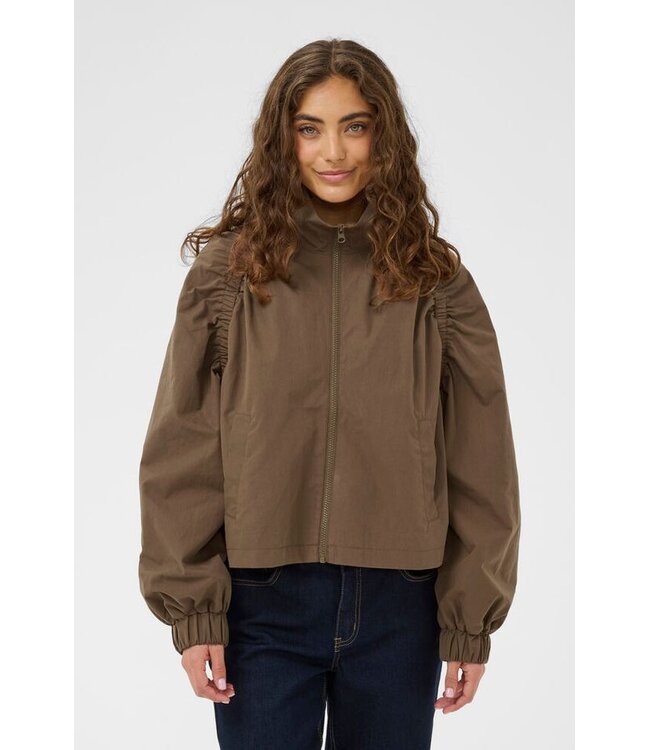 Zip-up jacket with structured silhouette, high stand collar, ruched raglan sleeves and adjustable drawstring hem. Relaxed, slightly cropped fit offers a modern edge. Lightweight texture for everyday style.