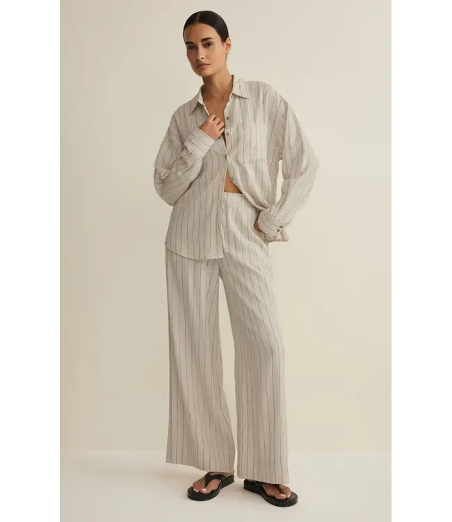 Made from a washed linen blend, these high rise linen pants feature side seam pockets, a stripe print, and an elastic waistband with drawcord. Pair with the Alfie Striped Button Up Top or a white tank for an effortless look.