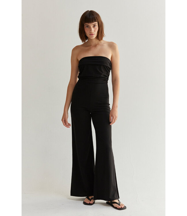 The Kaitlyn Jumpsuit features straight neckline, side shirring on the top bodice, invisible zipper at side, and wide leg pants with slit detail at the bottom.