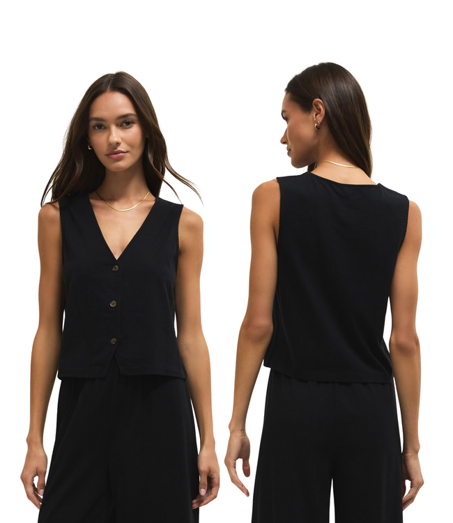 This sleeveless top will be an easy wardrobe staple with its button front, v-neck, and 100% cotton jersey fabric. Make it your go-to outfit and pair with its matching pant or wide leg denim.