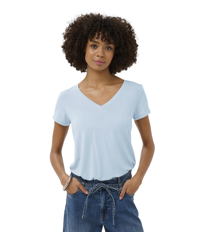 This women's V-neck T-shirt features a relaxed fit, short sleeves, and a gently curved hem for versatile everyday wear. The soft material ensures comfort throughout the day, making it ideal for layering or wearing alone.