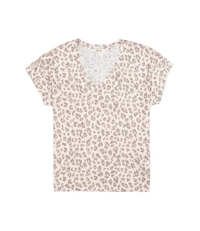 T-shirt with a leopard pattern. This T-shirt has a V-neck, short sleeves, and a regular fit. This item is made of 65% recycled polyester and 35% viscose.